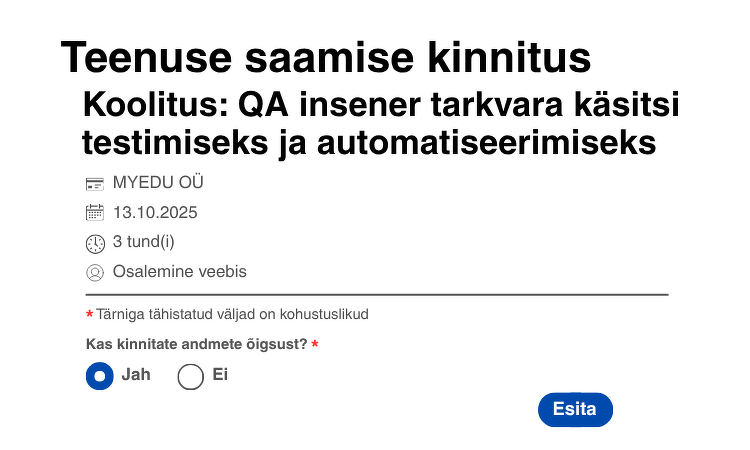 При переходе по ссылке вы увидите вопрос “Kas kinnitate andmete õigust?” («Подтверждаете ли вы точность данных?») и две кнопки — “Jah” and “Ei” («Да» и «Нет»). Вам нужно подтвердить участие в уроке, нажав кнопку «Jah»: